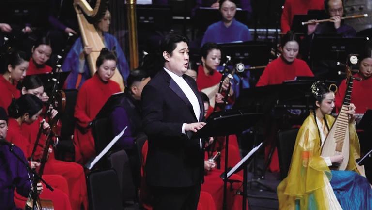 國(guó)樂(lè)版《敦煌·慈悲頌》,根據(jù)民族樂(lè)隊(duì)的特點(diǎn)傾情打磨創(chuàng)作,將壁畫的戲劇情節(jié)用音樂(lè)呈現(xiàn),通過(guò)壁畫與音樂(lè)旋律的結(jié)合,展現(xiàn)偉大的敦煌藝術(shù),彰顯中華傳統(tǒng)文化中向善向上的精神力量。圖為演出現(xiàn)場(chǎng)。