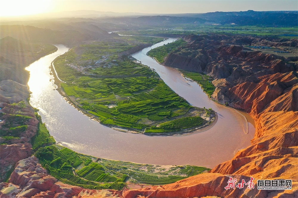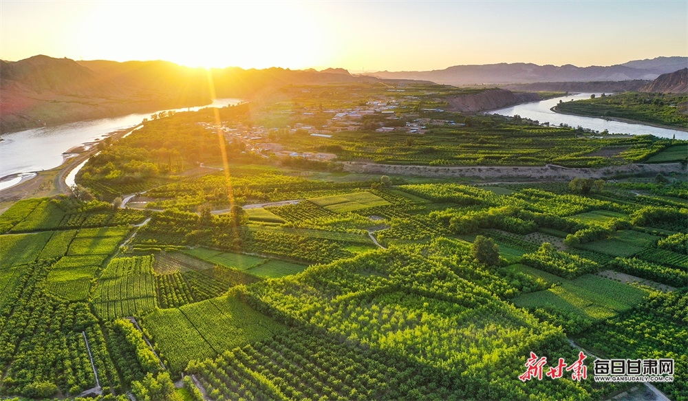 夏日,夕陽(yáng)西下,黃河在景泰五佛鄉(xiāng)境內(nèi)的車木峽繞了個(gè)大大的彎,位于黃河峽谷中的 車木峽山村高山環(huán)繞,周圍是成片的樹(shù)林,廣袤的田野閃耀著瑰麗的色彩,靜靜地躺在綠色的懷抱之中。