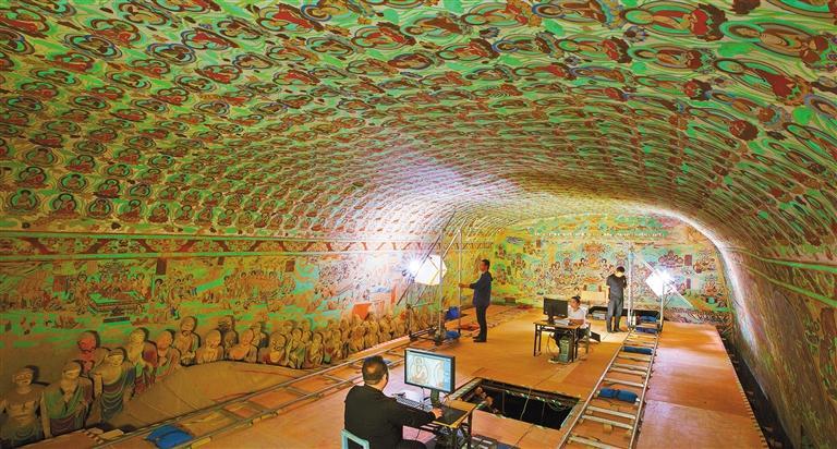 莫高窟第148窟數(shù)字化采集工作現(xiàn)場。敦煌研究院在國內(nèi)率先進(jìn)行文物數(shù)字化的探索研究,形成了一套科學(xué)的壁畫彩塑數(shù)字化技術(shù),制定了14項文物數(shù)字化保護(hù)技術(shù)標(biāo)準(zhǔn)與規(guī)范。