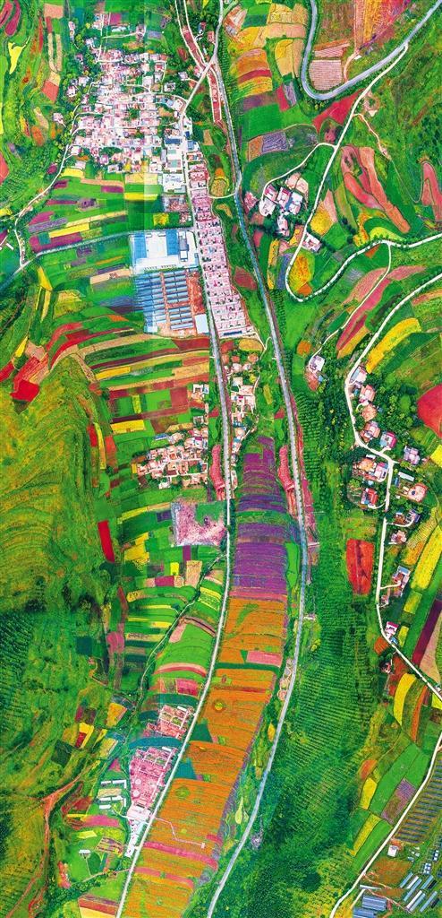 俯瞰渭源縣田家河鄉(xiāng)元古堆村新貌。元古堆村通過發(fā)展農(nóng)產(chǎn)品加工、鄉(xiāng)村旅游、電子商務(wù)、光伏發(fā)電等產(chǎn)業(yè)實現(xiàn)脫貧摘帽,日子越過越紅火。王 濤攝(中經(jīng)視覺)