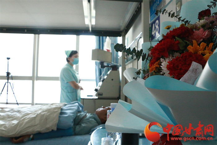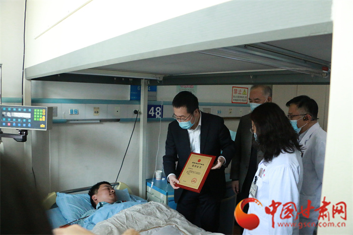 甘肅省紅十字會黨組書記、專職副會長楊芳勝為甘肅省第54例造血干細胞捐獻者龔先生頒發(fā)“博愛金獎”和榮譽證書
