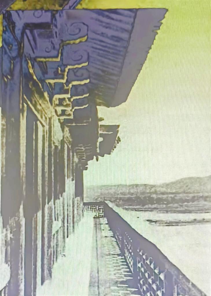 林競《西北叢編》一書載,其與蘭州友人于1919年2月7日出游雷壇河臥橋,“橋長十余丈,其形如弓,橋上蓋屋,足蔽風(fēng)雨,五彩繪畫,兩端有坊,東曰‘空中鰲背’,西曰‘天上慈航’,橋底無墩,自遠(yuǎn)望之,宛如臥龍。”林競還詳細(xì)記錄了蘭州雷壇河臥橋的建造方法,并對(duì)之科學(xué)性表示肯定:“聞此橋原來有墩,因某年山洪爆發(fā),被其沖毀,自是始改今式。其法,先將兩岸之橋基筑好,以數(shù)丈長之巨木直列成排,復(fù)以橫木連之,木材之?dāng)?shù),依橋之寬狹而定,其前端伸出橋中約二三尺,其后端即以巨石壓之,如是疊架不已,每加一層,即前端伸過下層數(shù)尺,如倒掛之階梯然。而層與層之間,復(fù)聯(lián)以鐵環(huán)及釘木,迨兩岸相距不遠(yuǎn)時(shí),即以巨木渡之。此種構(gòu)造,在西北往往因河水湍急,不能筑墩,或游牧之民,不知在河中建筑橋墩之法而始用之。然亦甚合於力學(xué)原理,未可忽視也。”