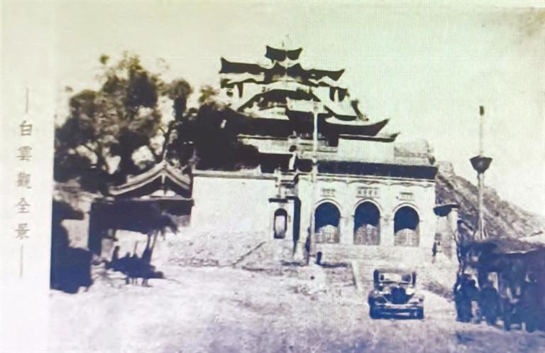 1935年5月,邵元沖考察西北途經(jīng)蘭州,專程赴崔家崖白云觀參訪?!段鞅彪S軺記》載:“依極壽山麓,建白云觀,高三百余級(jí),黃流襟帶,榆柳成蔭,書長無事,凝坐其間,聆水聲潺湲,聽鳥語啾啁,亦足滌塵煩,消炎夏。”邵元沖為此特作《題崔家崖白云觀》詩曰:“玄都峙重崖,清磬林間響。俯瞰大河橫,寒流走混□。柳晚翠煙浮,閑云獨(dú)來往。”《西北攬勝》一書中,專門刊載兩幅崔家崖白云觀照片,照片說明曰:“北臨黃河,南接蘭山,形勢雄壯,殿宇倚坡上筑,宏麗精巧,且曲徑回廊,引人入勝,亦蘭垣名勝之一也。” 從老照片中可見,崔家崖白云觀依山而建,頗具氣勢,而且交通便利,邵元沖一行乘坐的小汽車可以直達(dá)觀前。