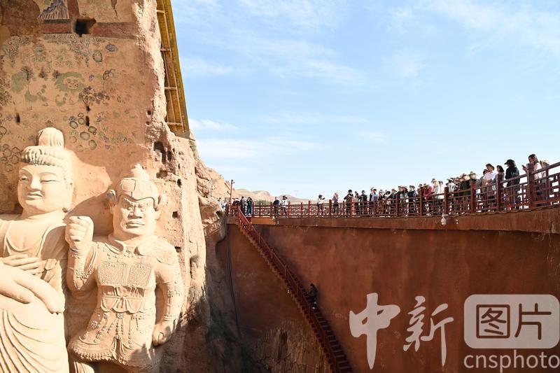 4月16日,甘肅省武威市涼州區(qū),學(xué)生在天梯山石窟參觀研學(xué)。