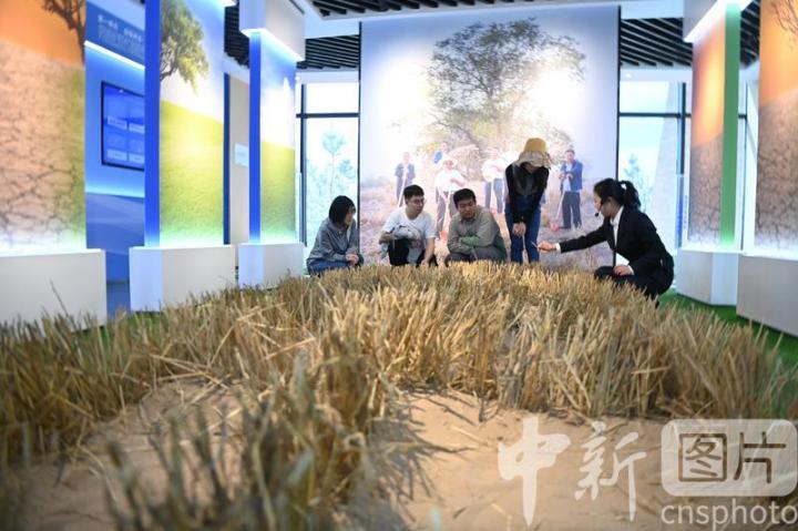 4月16日,甘肅省武威市古浪縣,學(xué)生們?cè)诎瞬缴沉蠞h治沙紀(jì)念館參觀。