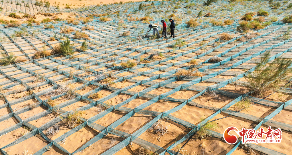 6月13日,張掖市高臺(tái)縣黑泉鎮(zhèn)北部荒漠區(qū)防沙治沙工程現(xiàn)場(chǎng),林業(yè)技術(shù)人員正在壓沙方格內(nèi)查看栽植梭梭的生長(zhǎng)情況。