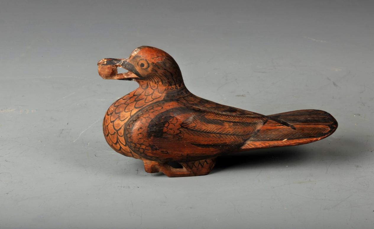 木鳩是王杖的杖首。在武威市博物館里,就有一件國(guó)寶級(jí)文物漢代彩繪漆木鳩:一只臥姿木質(zhì)鳩鳥(niǎo),雙目平視,口中含物,兩翼收攏于背部,尾呈平行片狀,兩足曲伸,中有方形卯,為杖桿接榫處。通體墨彩繪制,從頸至腹繪魚(yú)鱗狀羽毛,兩翼及尾上部繪魚(yú)骨狀羽毛?!逗鬂h書(shū)·禮儀志》中記載:“王杖長(zhǎng)九尺,端以鳩鳥(niǎo)為飾。鳩者,不噎之鳥(niǎo)也。欲老人不噎。”,“鳩”同于漢字“九”,有九九長(zhǎng)壽的寓意;鳩鳥(niǎo)被稱(chēng)為不噎之鳥(niǎo),表達(dá)了對(duì)老人吃飯不噎、身體康健的美好祝愿。