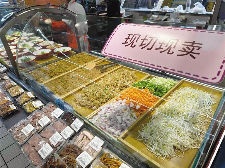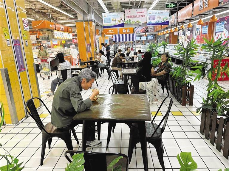 超市里的“平價食堂”,成為打造一刻鐘便民生活圈的重要載體。“超市周邊的居民、上班族、學生、酒店差旅客群的基礎比較大,所以增加快餐、堂食也是超市的一項便民舉措。”超市里升騰起的煙火氣,也讓超市的來客率明顯提升,“周末時,油條的銷量能達到1000根、豆腐腦能賣到500碗,不管是檔口、自助收銀機都有排隊的顧客。”