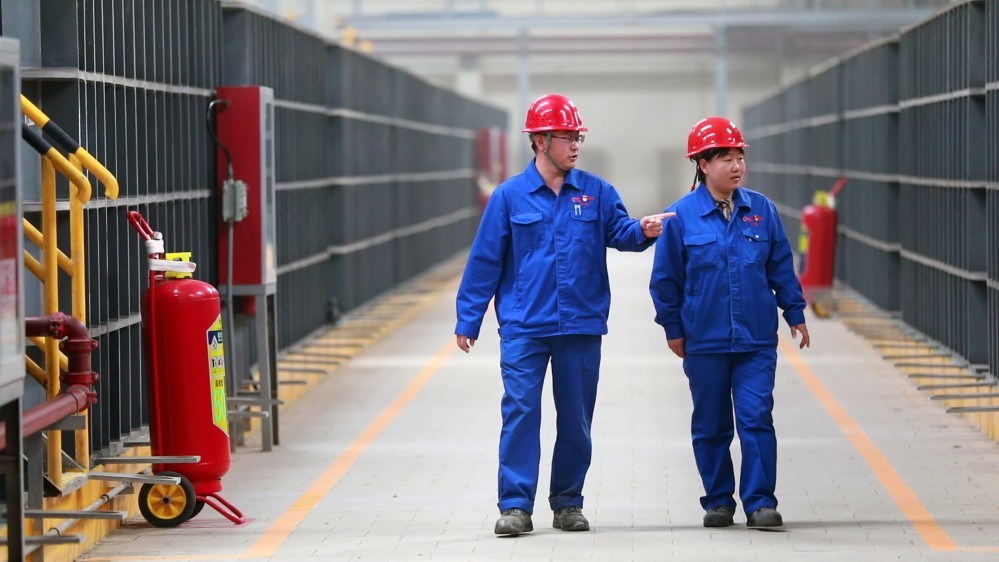在甘肅稀土公司11000噸萃取生產(chǎn)線,兩名工作人員在巡查這套集數(shù)字化、智能化和綠色化為一體的自動化生產(chǎn)線。(本報(bào)記者郭剛 攝)