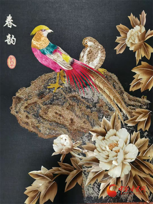 多年打磨后,郭百花走出了獨特的創(chuàng)作之路——以拼貼手法為主,讓作品更具層次感與立體感。在她十幾平米的“百花麥稈藝術(shù)工作室”里,《春韻》勾勒出江南詩意,《敦煌文旅》再現(xiàn)絲路風(fēng)情,《孔雀戲牡丹》盡顯雍容華貴,而《錦上添花》中,小鳥的羽毛竟由細(xì)如發(fā)絲的麥稈剪貼而成,市場價達(dá)1500元左右。這些作品里,既有山川花鳥的靈動,更藏著通渭的鄉(xiāng)土記憶,平凡麥稈在她手中徹底“化腐朽為神奇”。