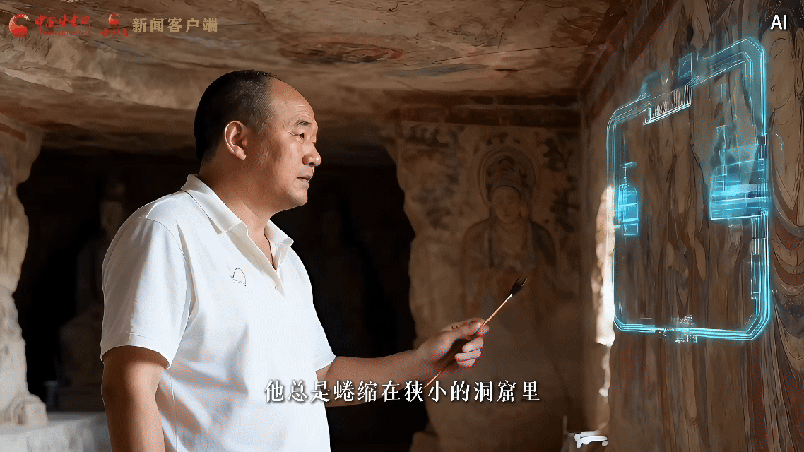 李波接過父親李云鶴的接力棒,操作AI系統(tǒng)開展修復(fù)工作,他遵循 “干一行、愛一行,鉆一行、精一行” 的理念,從學(xué)徒成長為“全國技術(shù)能手”,讓“莫高精神”在戈壁灘延續(xù)。