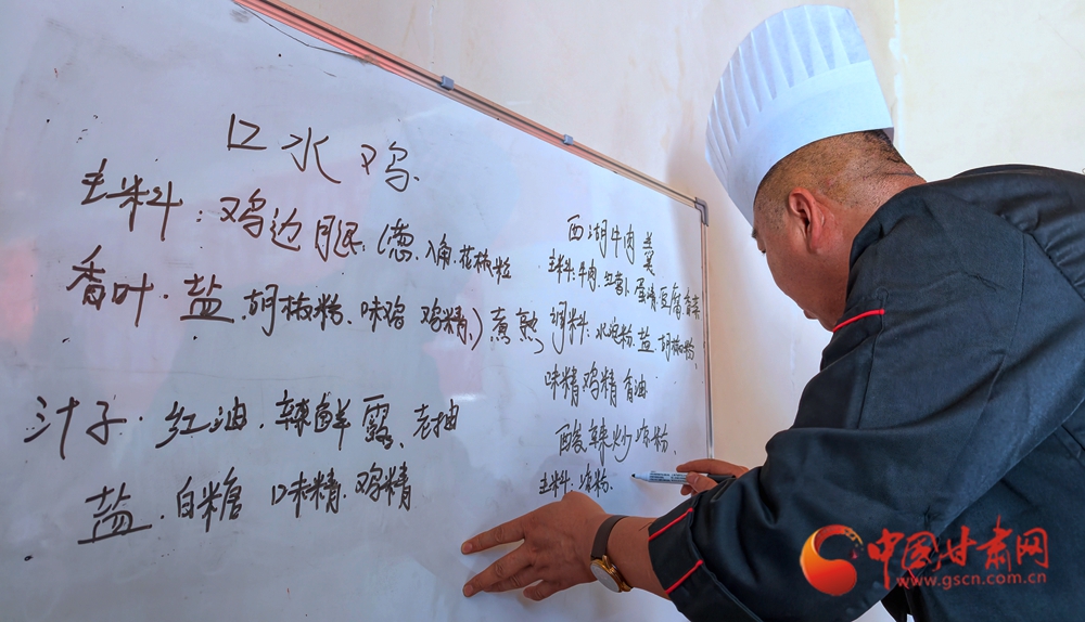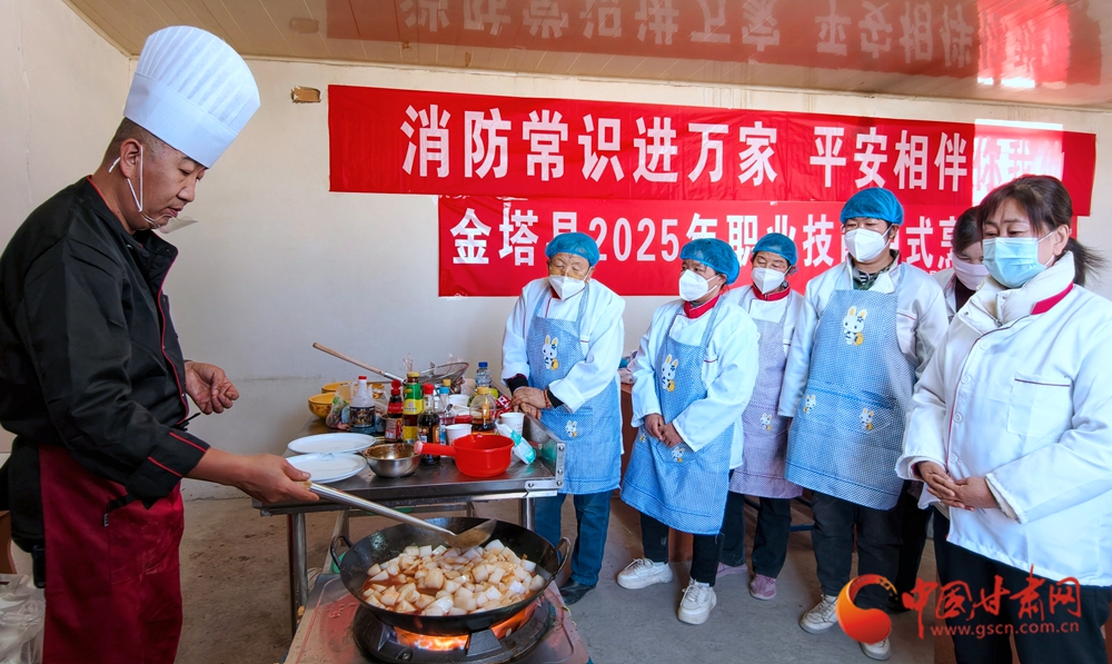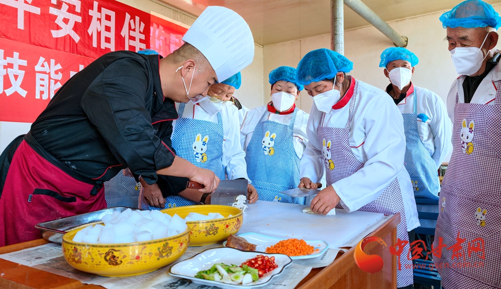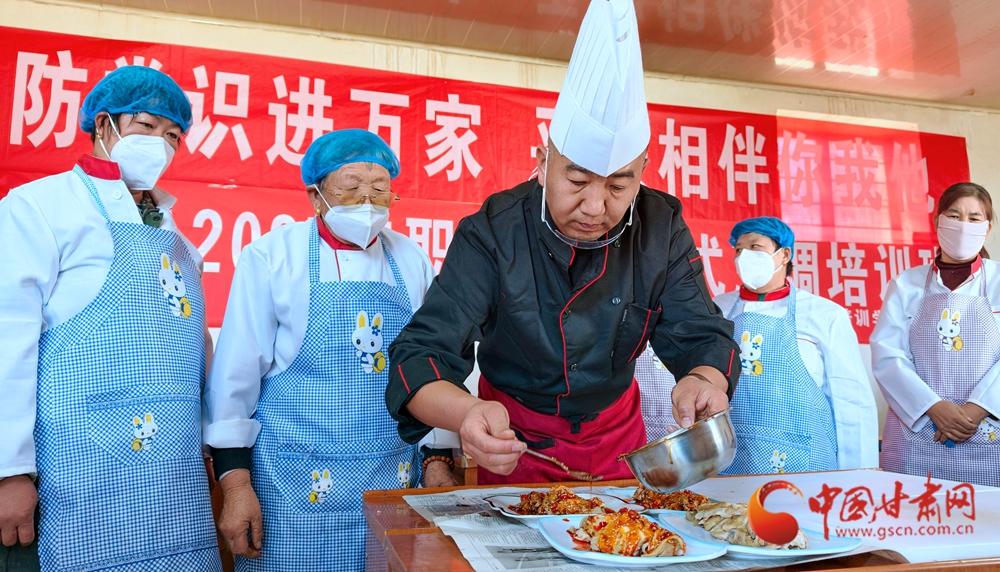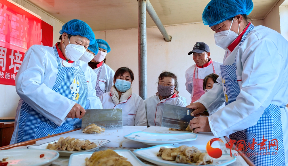 11月4日,金塔縣古城鄉(xiāng)頭號(hào)村,村民在培訓(xùn)老師指導(dǎo)下正在學(xué)習(xí)廚藝。