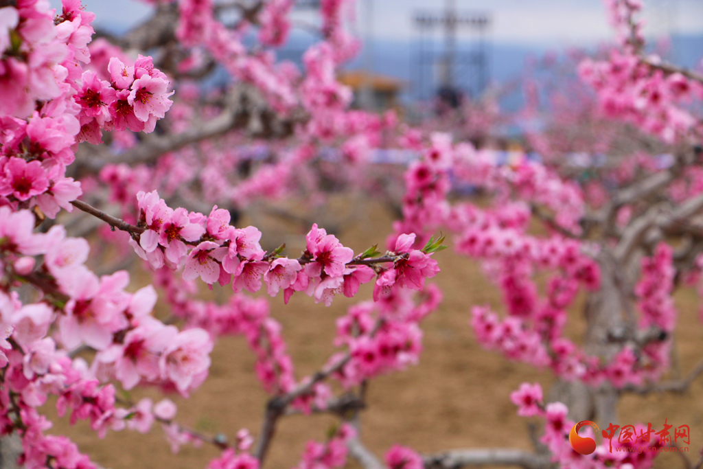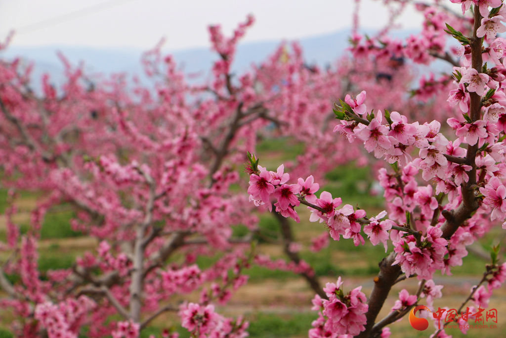 春風(fēng)拂過,桃花競相綻放,粉花滿枝與遠(yuǎn)山交相輝映,宛如一幅詩意畫卷。