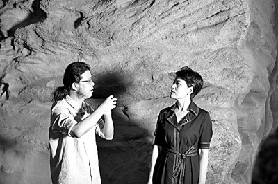 主講人王南(左)與主持人張小琴在云岡石窟現(xiàn)場(chǎng)交流。