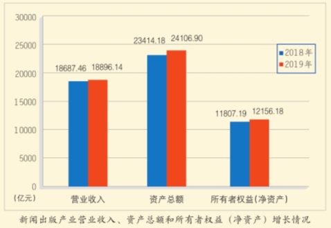 國家新聞出版署日前發(fā)布《2019年新聞出版產(chǎn)業(yè)分析報告》《2019年全國新聞出版業(yè)基本情況》。數(shù)據(jù)顯示,2019年,新聞出版產(chǎn)業(yè)規(guī)模繼續(xù)增長。全國出版、印刷和發(fā)行服務(wù)實現(xiàn)營業(yè)收入18896.1億元,較2018年增長1.1%;擁有資產(chǎn)總額24106.9億元,增長3.0%;所有者權(quán)益(凈資產(chǎn))12156.2億元,增長3.0%。