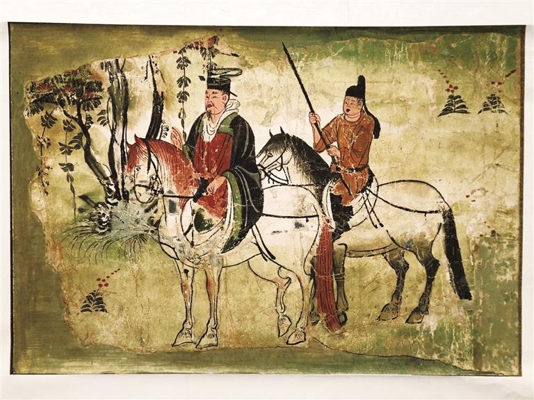 《兩位騎馬人》圖是大唐作品,現(xiàn)藏于法國吉美博物館。畫面上前面一匹紅鬃馬背上騎著一位男士,他身穿黑紅兩色長枹,佩冠。后面黑鬃馬上的男士好像是仆人,雙手持杖,戴冠穿長衫。畫面上人馬造型比例準(zhǔn)確到位,用筆自然流暢,駿馬強(qiáng)壯有力,人物體魄強(qiáng)悍。
