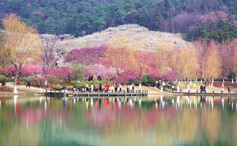 進(jìn)入景區(qū),走過(guò)一座石拱橋,眼前,一汪清水,綠意萌發(fā),乃傳說(shuō)的“鹿女湖”。不時(shí)用手撩撥著拂面的楊柳,沿湖畔小徑繞行數(shù)百米,往上攀登,穿過(guò)一個(gè)山口,整個(gè)梅嶺景區(qū),便不驚不乍,呈現(xiàn)在眼前。霎時(shí),我們被如此壯觀的山水梅林驚呆了。清凌凌的湖水邊、亭臺(tái)水榭間,依山而栽種的梅樹(shù),紅的、白的、粉的、綠的梅花,競(jìng)相綻放,層層疊疊、婆娑飛舞,爭(zhēng)芳斗艷、姹紫嫣紅,儼然一幅3D山水畫(huà),仿佛置身“香國(guó)仙境”。