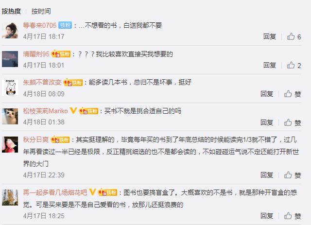 此前,部分網(wǎng)友在中新經(jīng)緯微博評論對“圖書盲盒”現(xiàn)象開展討論。有網(wǎng)友提到,“其實挺理解的,畢竟每年買的書到了年底總結(jié)的時候能讀完1/3就不錯了,過幾年再看讀過一半已經(jīng)是極限,反正精挑細選的也不是都會讀的,不如碰碰運氣說不定還能打開新世界的大門。”也有網(wǎng)友認為,“不想看的書,白送我都不要”“買書不就是挑合適自己的嗎”等等。