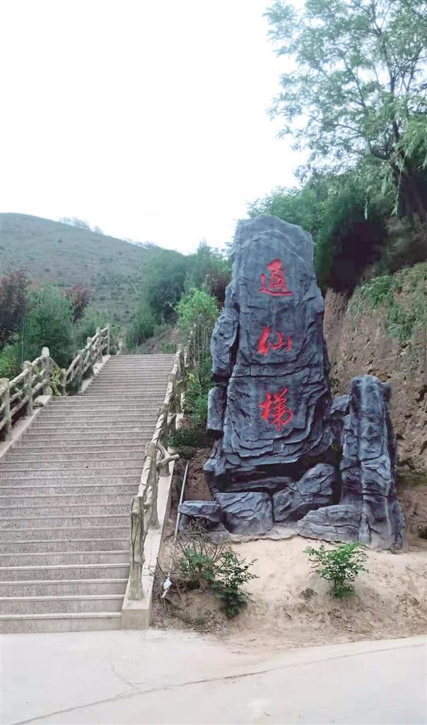 一條羊腸小道蜿蜒了千年,承載了無(wú)數(shù)游覽者匆匆的步履,在人們無(wú)數(shù)次的暢想中,化成了一條金光大道,讓老人、孩童和物資可直達(dá)寺窟門外。醒目的“通仙梯”石刻指引人們沿著游步道拾級(jí)而上,領(lǐng)略綠樹掩映、曲徑通幽的絕好勝景,金黃的葉子在濃密的綠葉間格外鮮亮,松樹和柏樹你擠著我,我挨著你,密密匝匝,在五月的陽(yáng)光和微風(fēng)中,吟唱著生命的贊歌。白色槐花香氣馥郁,紅色槐花鮮艷奪目,它們從高高的枝頭垂下來(lái),或從山崖斜伸而出,或與游人摩肩而過(guò),或者親呢的撫摸一下游人的笑臉。掩映綠樹中的亭子,是一道絕好的景觀,讓人產(chǎn)生一種遐想和逗留的念想。亭子旁叫不出名的小鳥輕盈的飛舞和歡快的鳴叫,增添了一種活潑美妙的情趣。這情趣給花樹、亭子帶來(lái)一種靈性,頻添了無(wú)限韻味和妙趣。