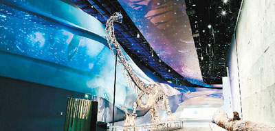 進入展廳,人們首先會被來自侏羅紀時代的龐然大物——中加馬門溪龍化石所震撼。馬門溪龍是中國發(fā)現(xiàn)的體型最大的蜥腳類恐龍之一,頸部特別長。這具化石出土于新疆奇臺縣,2016年修復裝架完成,高7.5米,長24米,脖子就有12米長。