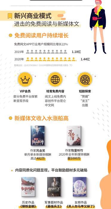而在近年,免費(fèi)閱讀和新媒體文成為新興商業(yè)模式,得到快速發(fā)展。其中,免費(fèi)閱讀和新媒體文激活了下沉市場(chǎng),成為刺激數(shù)字閱讀市場(chǎng)快速發(fā)展的新興力量,為網(wǎng)絡(luò)文學(xué)的內(nèi)容和用戶帶來新增量,也拓寬了網(wǎng)絡(luò)文學(xué)市場(chǎng)規(guī)模。