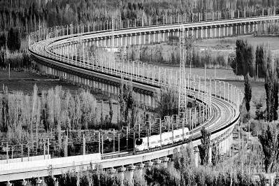 伴隨改革開放大潮,中國(guó)發(fā)展日新月異,高鐵、快遞、“天眼”望遠(yuǎn)鏡、粵港澳大橋等新事物都被詩(shī)人們?nèi)谌朐?shī)行。圖為行駛中的蘭新高鐵列車。新華社發(fā)(蔡增樂攝)
