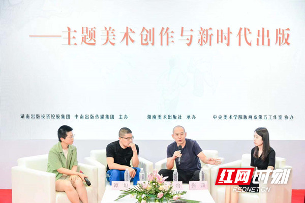 活動(dòng)現(xiàn)場(chǎng),康劍飛、武將、《少年毛澤東》項(xiàng)目藝術(shù)指導(dǎo)譚坦、《少年毛澤東》項(xiàng)目執(zhí)行張瑄等四位嘉賓,圍繞主題美術(shù)創(chuàng)作與主題出版、插圖與繪本演變、版畫(huà)的發(fā)展與傳播特點(diǎn)等議題展開(kāi)討論,并結(jié)合湖南美術(shù)出版社即將出版的《少年毛澤東》,分享了創(chuàng)作心得,還與現(xiàn)場(chǎng)的讀者進(jìn)行了互動(dòng)交流。