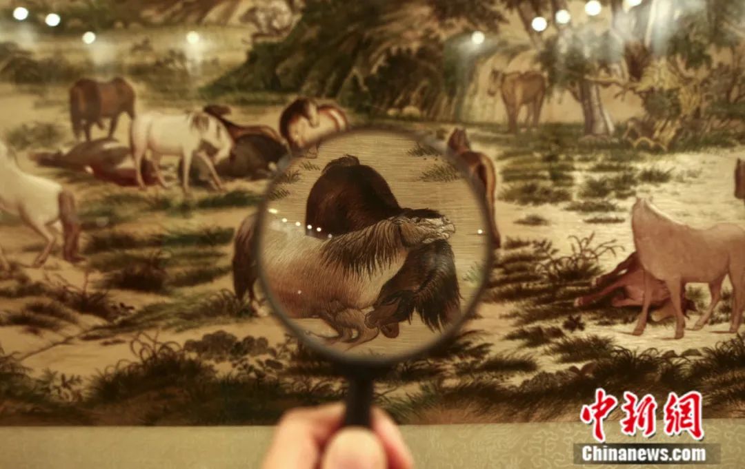 觀眾用放大鏡觀看以郎世寧《百駿圖》為藍本的蘇繡作品。中新社記者 張浩 攝