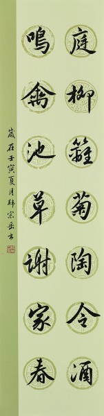 庭柳籬菊陶令酒,鳴禽池草謝家春。 釋文:庭前柳樹,籬邊菊花,陶淵明飲酒于此,怡然自得;池塘里長滿了春草,樹上的鳴鳥冬去春來,謝靈運(yùn)因此寫出了這樣的千載名句。韓宗岳(滿族)