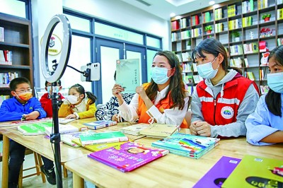 在江蘇如皋市如城街道顧莊社區(qū)農(nóng)家書屋內(nèi),志愿者通過網(wǎng)絡(luò)平臺為學(xué)生推薦好書。徐慧攝/光明圖片