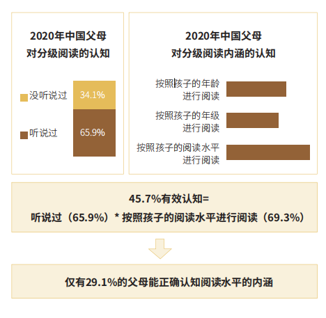 雖然分級閱讀已經(jīng)成為國際公認(rèn)的閱讀趨勢,可是,從當(dāng)當(dāng)聯(lián)合艾瑞發(fā)布的《2020年中國K12階段學(xué)生“分級閱讀”白皮書》(以下簡稱《白皮書》)中,我們發(fā)現(xiàn)中國大部分父母對于分級閱讀尚缺乏認(rèn)識,更談不上有足夠的重視?!栋灼分赋?,有65.9%的父母聽說過“分級閱讀”,而其中真正了解“分級閱讀”的父母只占45.7%。