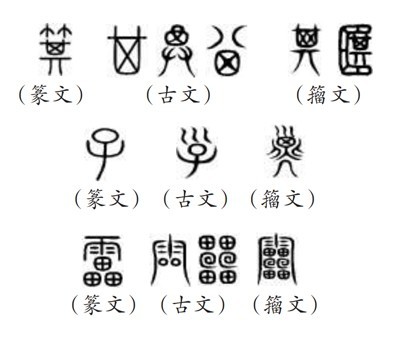 ?。ㄎ澹┧^“9353”,指的是《說文》所收全部正篆,即《說文》分析解釋的全部字?!墩f文》收字以篆文為“正”,作為標(biāo)準(zhǔn)字體,這就是許慎所說的“今敘篆文,合以古籀”的收字原則。“今敘篆文”,就是以篆文(小篆)作為標(biāo)準(zhǔn)正字,同時也會根據(jù)需要收列部分古文和籀文。《說文》所謂“古文”主要是孔子壁中書和民間所獻(xiàn)古文經(jīng)所用的文字,“籀文”即傳為西周晚期太史籀所編字書《史籀篇》上的文字。從《說文》來看,收入的古文、籀文,主要是與篆文有明顯差異的字形。如篆文“箕”“子”“雷”下所收列的古文、籀文: