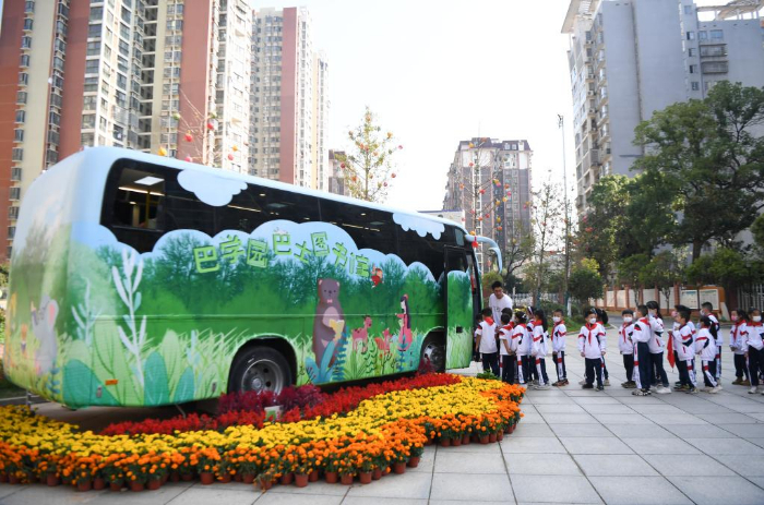 11月10日,長(zhǎng)沙市青園友誼小學(xué)的學(xué)生排隊(duì)進(jìn)入巴士圖書館。