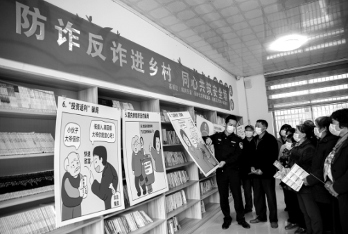 圖為在楊花橋村農(nóng)家書(shū)屋內(nèi),民警向老人宣傳電信詐騙、養(yǎng)老詐騙等防詐知識(shí),提升農(nóng)村老人識(shí)騙能力。