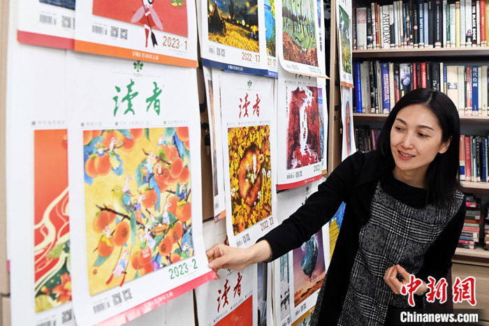 圖為2月20日,陳天竺向中新社記者介紹《讀者》雜志往期封面。 中新社記者 九美旦增 攝