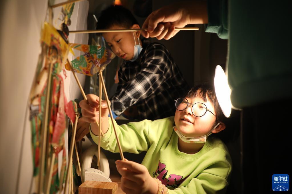 4月1日,在甘肅省蘭州市的讀者出版集團(tuán)數(shù)字閱讀中心讀者小站,小朋友體驗(yàn)中國神話故事主題皮影戲。新華社記者 馬希平 攝