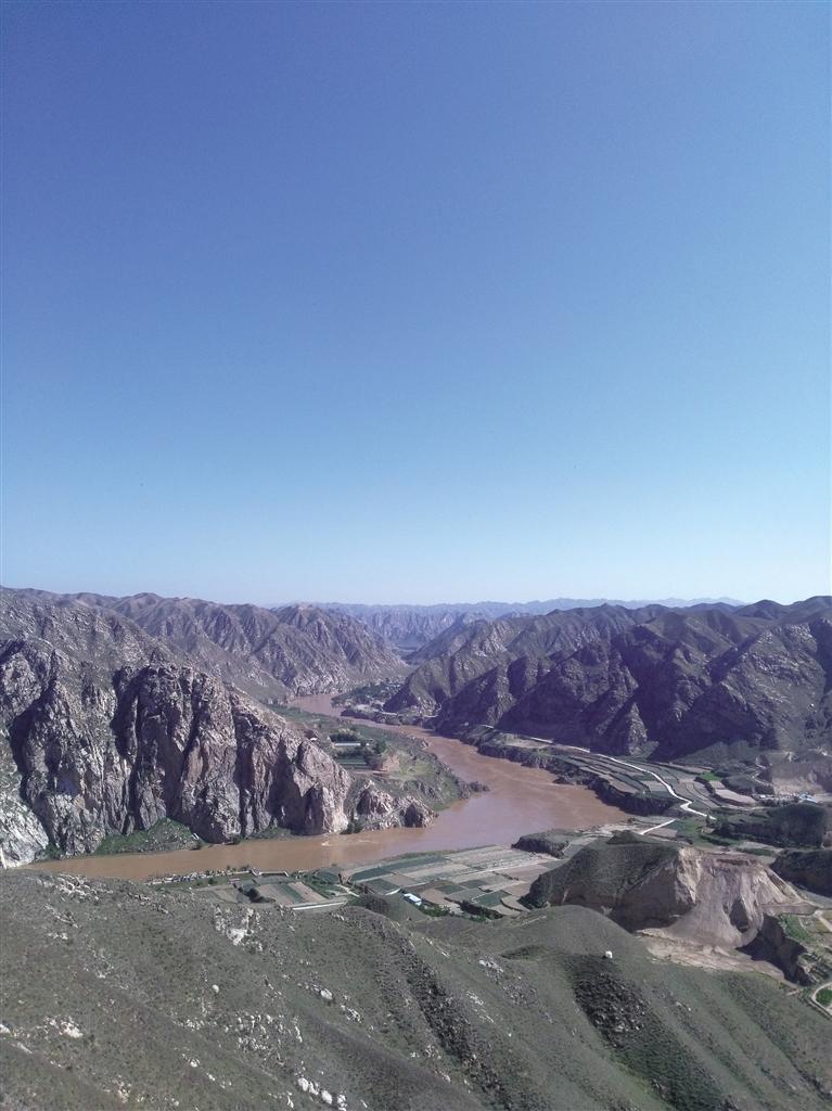 向西鳥瞰黃河,黃河幾乎直線撲面而來,河水發(fā)黃,流淌緩慢。過去這里,河水湍急,老遠(yuǎn)就能聽到咆哮之聲。由于20世紀(jì)末,在下游20公里處建了小峽水庫,河水被抬升,河水流緩。黃河北面,依然是光禿禿的山巒。低頭看腳下的黃河,南岸的漢長城遺址清晰可見,旁邊有二三個人在農(nóng)田勞作。黃河流到此處,被腳下的九圪垯山迎面阻擋,折而向北,切開重重山巒,帶著野性,蜿蜒而去,一點兒也不留戀桑園子峽,不留戀九圪垯山,不留戀滄桑的大地和歲月。