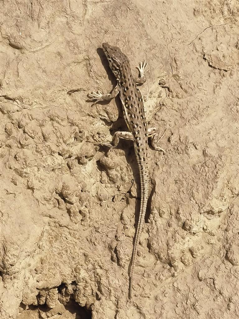 即將到達(dá)山頂,腳底下發(fā)現(xiàn)了亂竄的小蜥蜴。這是當(dāng)?shù)爻R姷囊环N小蜥蜴,就是壁虎,當(dāng)?shù)厝朔Q為蝎虎子、七寸子。土皮色,半厘米粗,5至10厘米長,跑的很快,有很強的自我保護(hù)意識。若被人或獵食者抓住尾巴,會主動斷掉尾巴逃跑,后在不到一個月的時間內(nèi),長出新尾巴。盡管有此本領(lǐng),但往往還是鷹和烏鴉等食肉飛禽及蛇的獵物。