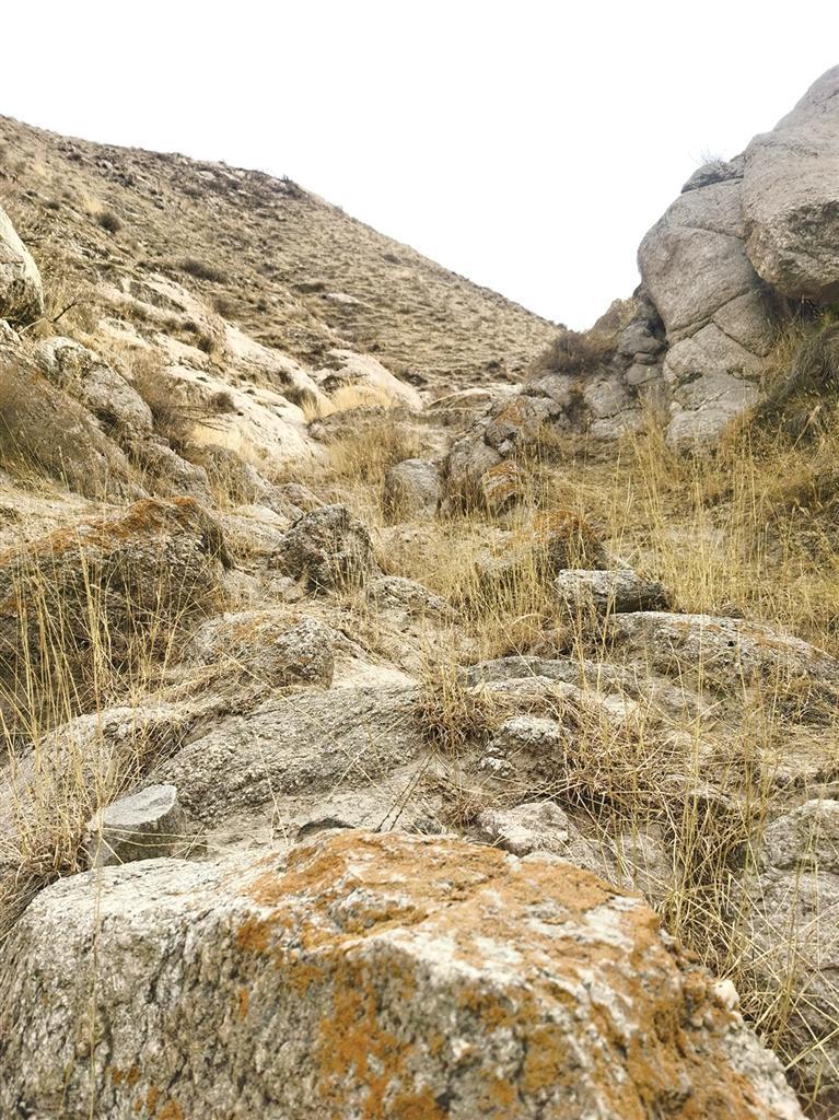 東坪向東300米,就是榆中境內(nèi)唯一遺留的一處漢長城遺址,該遺址現(xiàn)只有一處墻墩,緊鄰黃河,圍長40 余米,高約5米,無任何防護(hù)措施,墻壁上,有磚、石混雜其中,人工夯筑之痕清晰可辨。西側(cè)墻面上,還有人掏挖的小窯洞。高1.3米,深達(dá)50厘米。破壞嚴(yán)重。漢長城遺址再向東200米,東金公路向右拐入七峴溝,向來紫堡川而去,而黃河則被東面的大山阻擋,無路可去,左拐北折而流向什川。此處就是著名的黃河大“幾”字灣的第一灣。第一灣的南岸,有十來戶人家,地名叫駱圈灣。由于地處古絲綢之路,曾建有駱駝圈和小型客棧供駱駝客隊歇腳而又在黃河拐彎處而得名,后來,因諧音,叫羅泉灣。山腳下,有七八棵楊柳已吐綠。沿黃河,已無路可尋,就沿洪水沖的山溝上東山,還是無路,甚至沒有羊腸小道,巖石裸露,怪石嶙峋,坡陡難行。巖石層只有七八十米厚。此山的石頭,含有石英成分,石質(zhì)軟,無開采利用價值。再往上,就是黃土層,直到山頂。由于干旱,整個山上,無一棵樹木,甚至連灌木都沒有。耐堿耐旱的駱駝蓬只發(fā)出二厘米的枝蔓,一些蒿草和矮草,也剛發(fā)芽,還有一些匍匐在地面的無名小草,卻已開出了扁豆大小的艷麗的小花,有白色的和淡藍(lán)色的蝴蝶飛起飛落。爬到半山腰,太陽已全面照曬,山坡雖陡峭,卻無陰涼可乘。渾身發(fā)熱,不得不解開衣扣,緩慢前行。