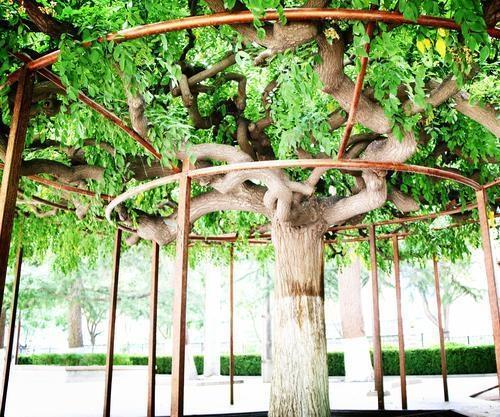 博物館里的這兩棵龍爪槐分別種植在展覽大樓前的東西兩角,是博物館的老專家郭維屏先生所種植。1959年秋冬,甘肅省博物館從通渭路舊館搬遷到七里河的新館,新館內(nèi)一片荒涼,亟待綠化。而就在此時(shí),郭維屏老先生調(diào)入博物館工作,參與到館內(nèi)的綠植規(guī)劃建設(shè),也正好發(fā)揮自己的藝術(shù)特長(zhǎng)。這兩棵龍爪槐的幼株是郭老先生從五泉山苗圃選購(gòu)的,栽種到展覽大樓前院的東西兩角,槐樹(shù)的周?chē)€設(shè)計(jì)了幾個(gè)形狀不一的花壇,花壇內(nèi)種植了各色各樣的樹(shù)木,一眼望去郁郁蔥蔥,生機(jī)盎然,頗有些韻味。這兩棵龍爪槐剛栽種時(shí)體型嬌小,看起來(lái)很不起眼。經(jīng)過(guò)郭老先生和博物館幾代人的悉心栽培,如今已是樹(shù)冠優(yōu)美,花香四溢。每到槐花盛開(kāi)的時(shí)候,滿庭飄香,沁人心扉,成了博物館里一道靚麗的景色,引得路人駐足欣賞。東角的龍爪槐高約2米,樹(shù)干粗達(dá)2尺多,樹(shù)冠如傘,頂端長(zhǎng)出八、九個(gè)主枝向四面伸展,屈曲盤(pán)繞,而后又分為數(shù)十個(gè)中枝和數(shù)百個(gè)小枝,互相攀援,屈折如爪,一枝獨(dú)秀。而西角的龍爪槐因基建的原因長(zhǎng)勢(shì)受到一定影響。