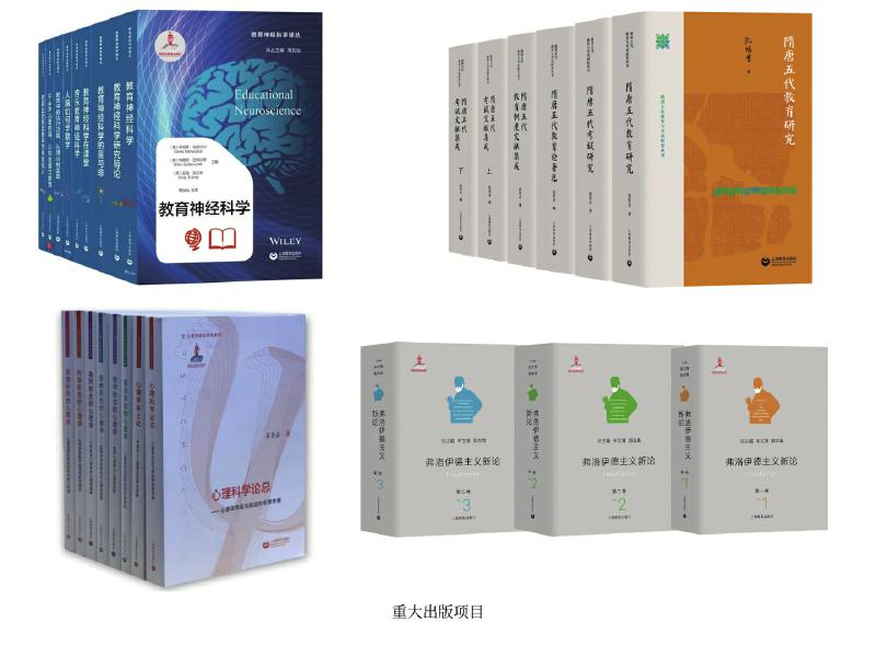 上教社密切關(guān)注新時代教育發(fā)展的重大理論問題與現(xiàn)實問題,響應(yīng)國家教育發(fā)展戰(zhàn)略需求,精心布局學術(shù)專業(yè)出版“大項目”,連續(xù)入選國家重點出版物出版規(guī)劃、2013—2025年國家辭書編纂出版規(guī)劃,獲國家出版基金資助。這其中除前文中的大型??乒ぞ邥?,還包括一系列教育與心理學原創(chuàng)研究和前沿研究成果:由中國教育史學者孫培青編著的“隋唐五代教育與考試研究叢書”,構(gòu)建了反映隋唐五代教育與考試全貌的教育理論體系和文獻資料體系,是中國教育史學科建設(shè)的一項學術(shù)文化積累工程;《中國課程史》以現(xiàn)代課程理論為分析框架,以歷史線索展現(xiàn)中國學校課程的新陳代謝;“教育神經(jīng)科學譯叢”(9冊)是我國首個聚焦教育神經(jīng)科學這一國際教育研究前沿領(lǐng)域的學術(shù)譯介系列;《中國傳統(tǒng)德育心理學思想新論》系統(tǒng)挖掘整理中華優(yōu)秀傳統(tǒng)文化中蘊含的德育心理學思想,構(gòu)建中國特色心理學話語體系;我國第一套以大心理學觀,從本土心理學視角系統(tǒng)探索和解讀不同形態(tài)心理學的學術(shù)系列“心理學形態(tài)研究系列”(6冊),全景考察心理學的命運與前途,深入探索中國本土心理學的選擇與突破;《弗洛伊德主義新論》(三卷)匯聚國內(nèi)弗洛伊德主義研究領(lǐng)域的權(quán)威學者,歷史展現(xiàn)弗洛伊德理論的百年發(fā)展歷程,提供弗洛伊德主義研究的“全景圖”。這些重大出版項目為構(gòu)建中國特色自主知識體系,建設(shè)中國教育學和心理學學科體系、學術(shù)體系、話語體系發(fā)揮了重要作用。