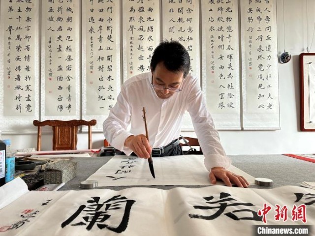 8月26日,甘肅通渭悅心國(guó)際書畫村,書法家在工作室創(chuàng)作。閆姣 攝