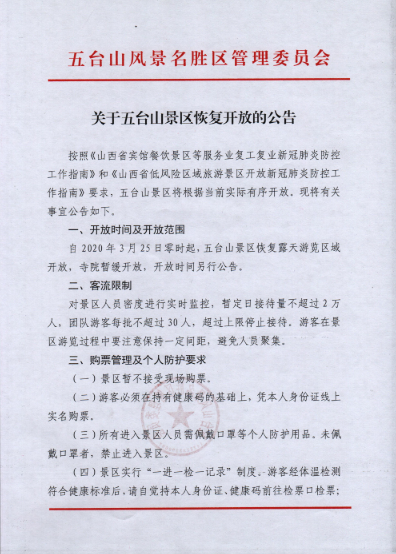 五臺山風(fēng)景名勝區(qū)管理委員會對外宣布,自2020年3月25日零時(shí)起,山西五臺山風(fēng)景名勝區(qū)恢復(fù)露天游覽區(qū)域開放,寺院暫緩開放,開放時(shí)間另行公告。