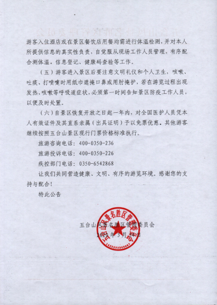 五臺山風(fēng)景名勝區(qū)強(qiáng)調(diào),恢復(fù)開放期間,五臺山將對景區(qū)人員密度進(jìn)行實(shí)時(shí)監(jiān)控。五臺山風(fēng)景名勝區(qū)管理委員會還宣布,自景區(qū)恢復(fù)開放之日起一年內(nèi),對全國醫(yī)護(hù)人員憑本人有效證件及其直系親屬(出具證明)予以免票優(yōu)惠。