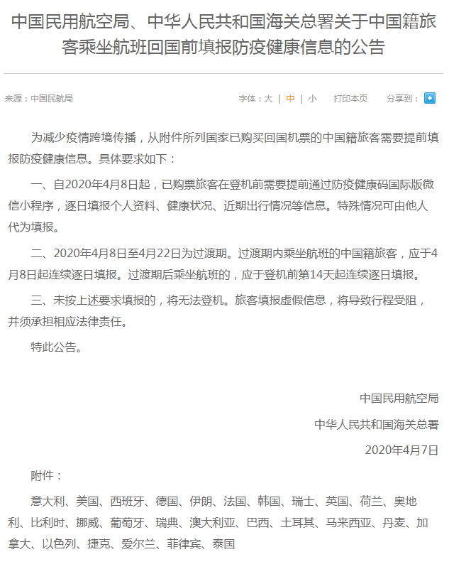 中國(guó)民用航空局、中華人民共和國(guó)海關(guān)總署4月7日聯(lián)合發(fā)布《關(guān)于中國(guó)籍旅客乘坐航班回國(guó)前填報(bào)防疫健康信息的公告》(以下簡(jiǎn)稱《公告》)?!豆妗分赋觯?/span>自4月8日起,從意大利、美國(guó)、西班牙等26個(gè)國(guó)家已購(gòu)買回國(guó)機(jī)票的中國(guó)籍旅客需要在登機(jī)前提前填報(bào)防疫健康信息,包括逐日填報(bào)個(gè)人資料、健康狀況、近期出行情況等。旅客未按要求填報(bào)的,將無(wú)法登機(jī);填報(bào)虛假信息,將導(dǎo)致行程受阻,并須承擔(dān)相應(yīng)法律責(zé)任。