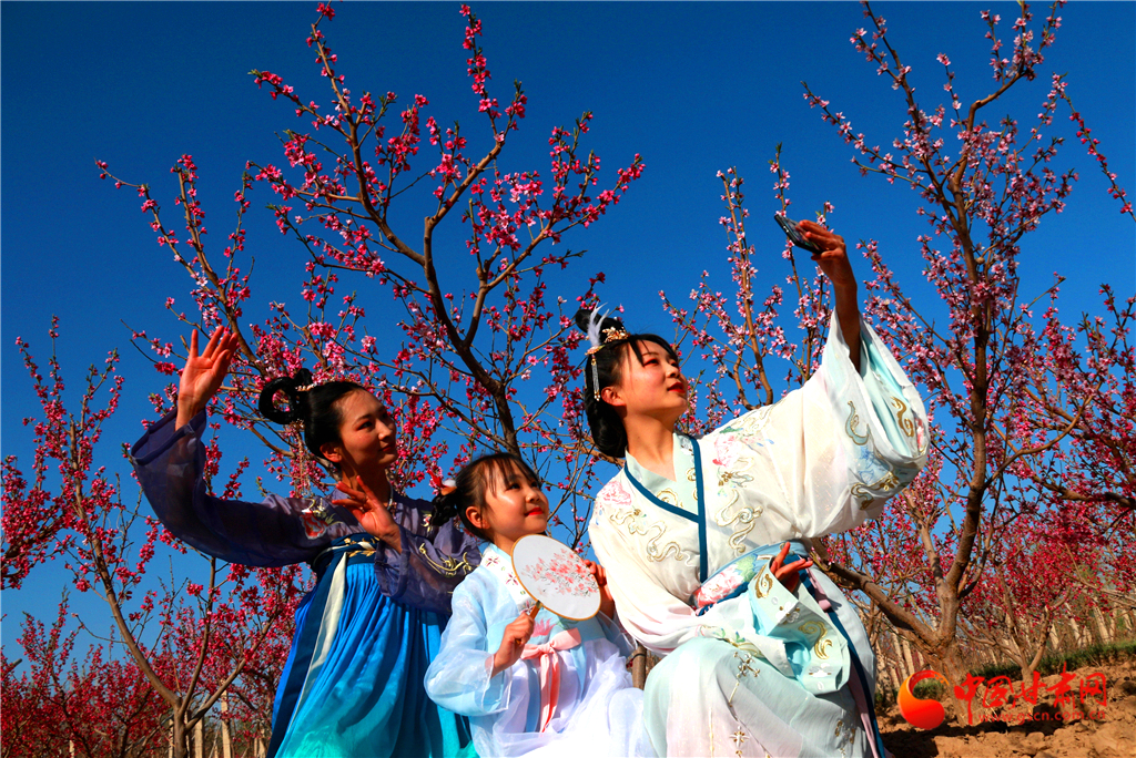 2020年4月22日,身著古裝的市民在甘肅省敦煌市七里鎮(zhèn)杜家墩村的桃園中拍照。