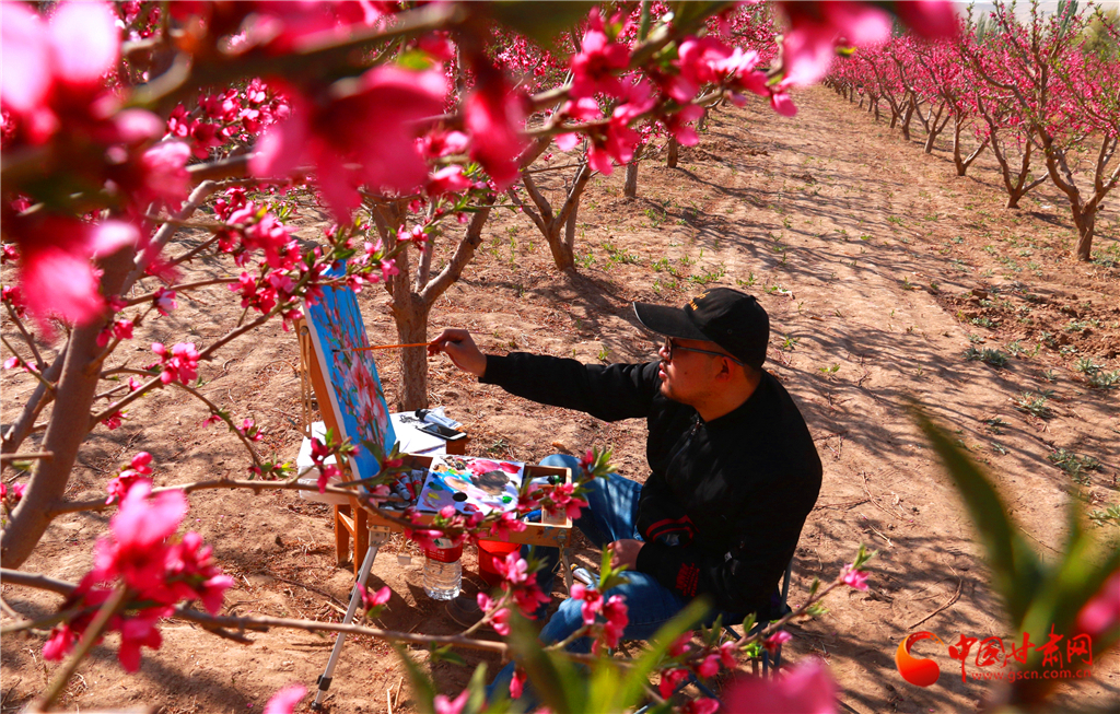 2020年4月22日,一名市民在甘肅省敦煌市七里鎮(zhèn)杜家墩村的桃園中寫(xiě)生。