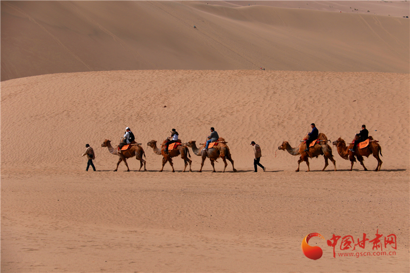 5月19日,游客在甘肅省敦煌市鳴沙山月牙泉景區(qū)游覽。