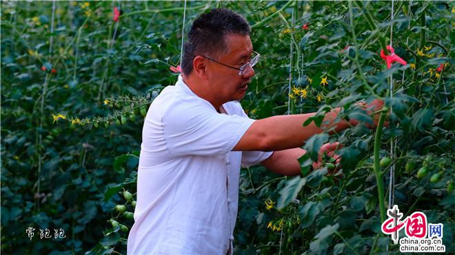 ?。▓D:番茄小鎮(zhèn)負(fù)責(zé)人毛建偉在摘番茄)