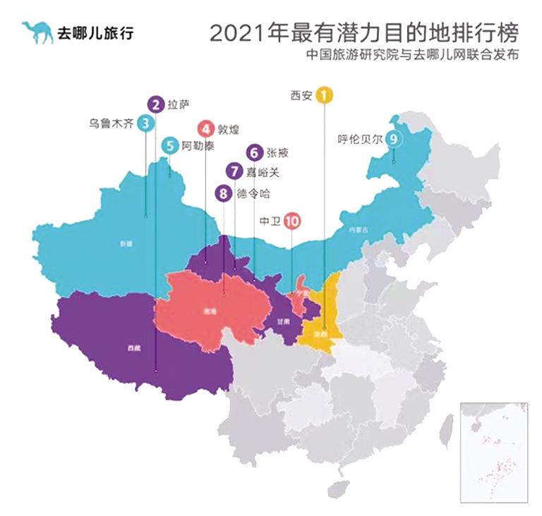 中國(guó)旅游研究院與去哪兒網(wǎng)課題組根據(jù)旅游目的地2020年和2019年的預(yù)訂增量、平均價(jià)格、出行時(shí)間和搜索熱度,發(fā)布2021年最有潛力目的地排行榜和2021年小眾旅游目的地排行榜。其中前十位的目的地包含我省敦煌、張掖、嘉峪關(guān)三座絲路名城,今年西北地區(qū)將在2021年吸引更多游客前往。